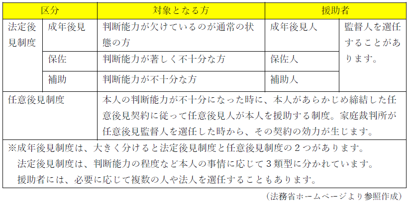 成年後見制度は、認知症、知的障がい、精神障がいなどにより物事を判断する能力が十分ではない人について、本人の権利を守る援助者(後見人等)を選ぶことで、本人を法律的に支援する制度です。