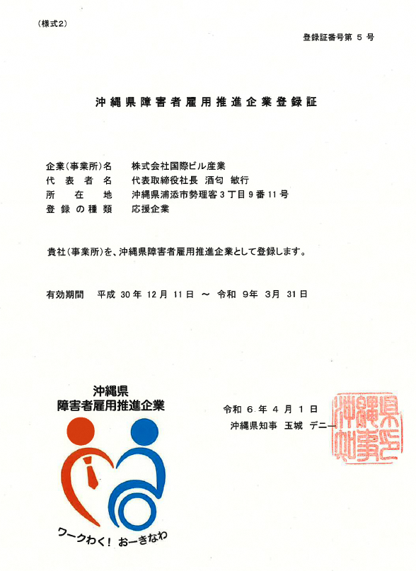 県の障がい者雇用推進企業として登録されています。