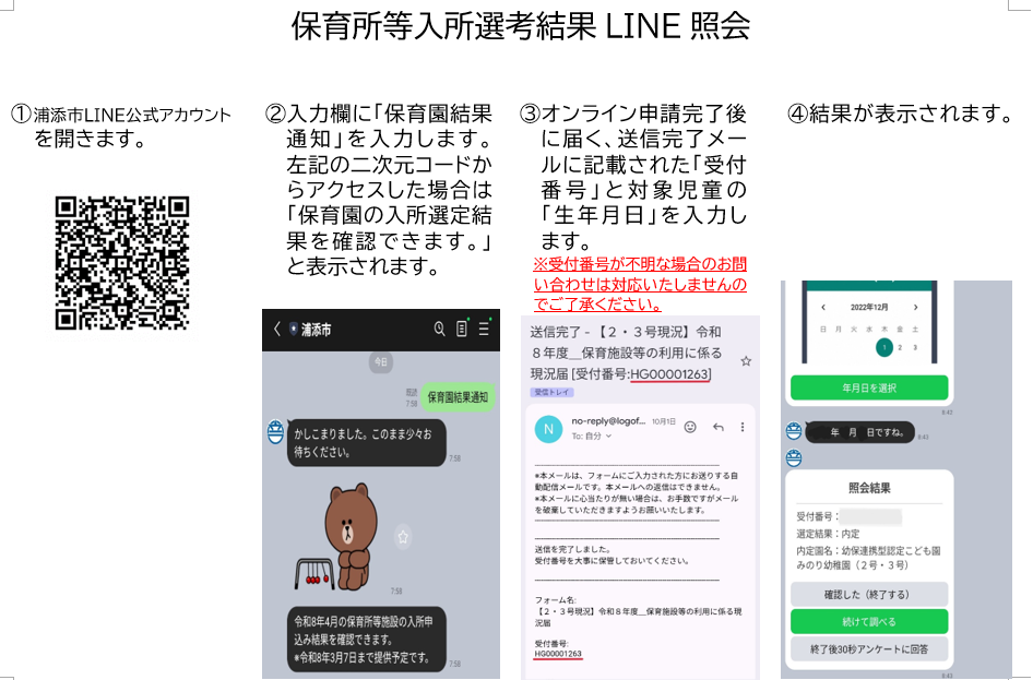 - オンライン申請者のみを対象に4月入所の一次選考結果を浦添市LINE公式アカウント上で照会できる取り組みを試験的に実施します。