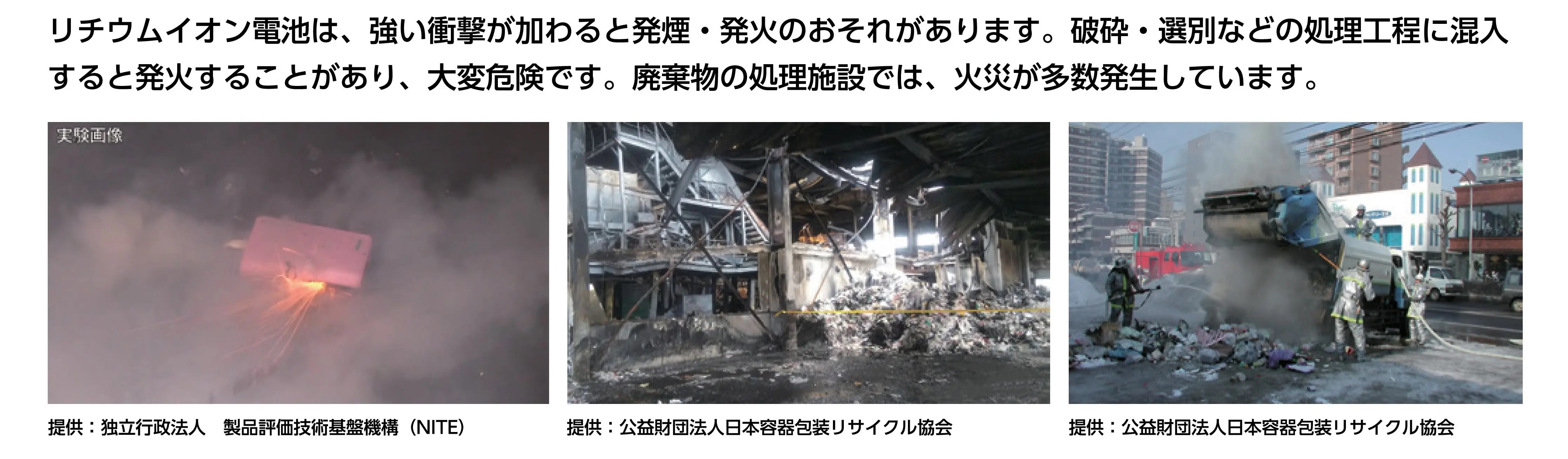 収集・破砕・選別などのごみ処理の工程の際に、発火し火災に繋がる恐れがありますので適正な分別・処分にご協力をお願いします。