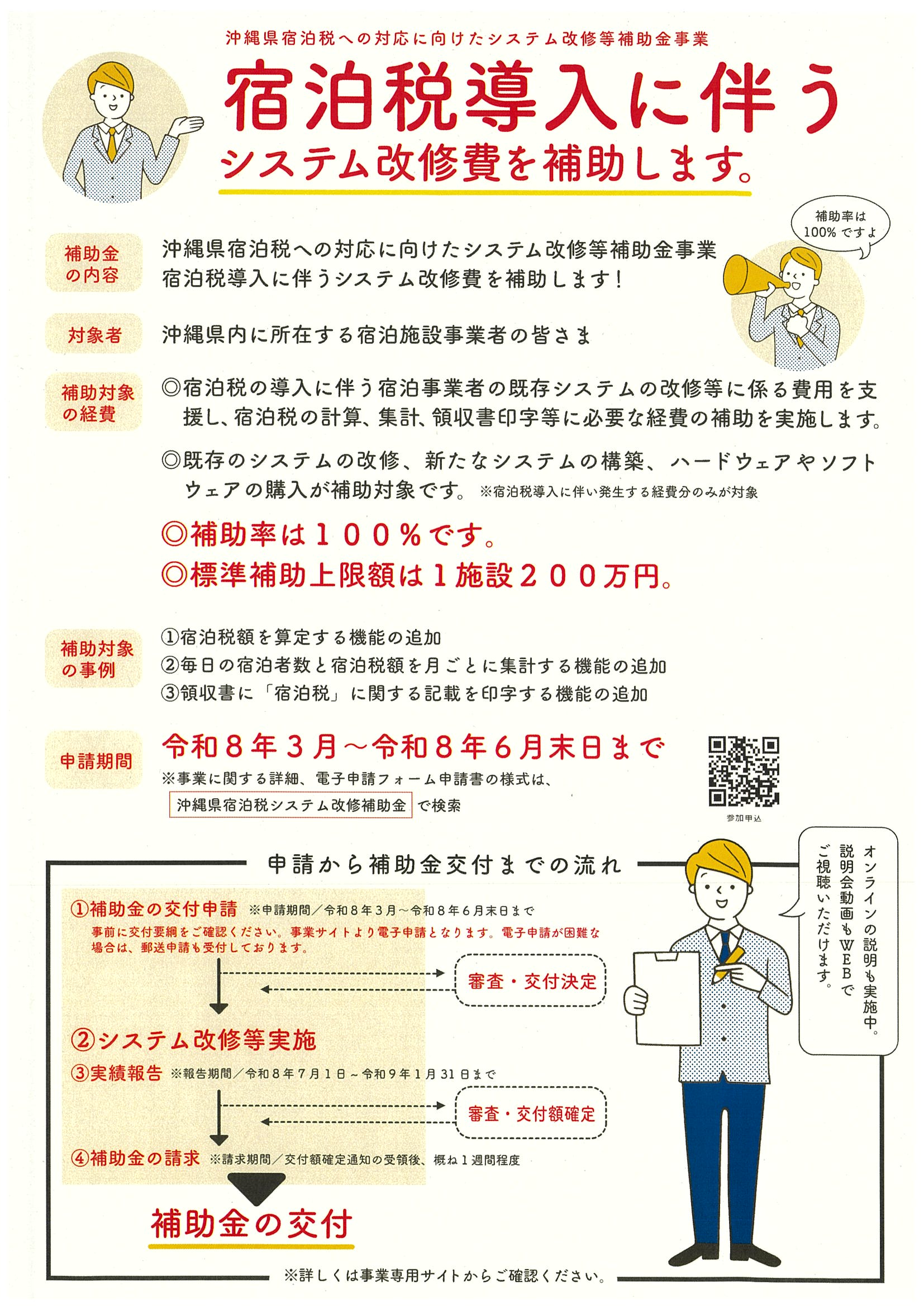 沖縄県では、令和9年2月1日から始まる宿泊税導入に伴い発生する宿泊事業者のシステム改修等に必要な経費を補助することとしており、令和8年3月1日からこの申請受付を開始しております。