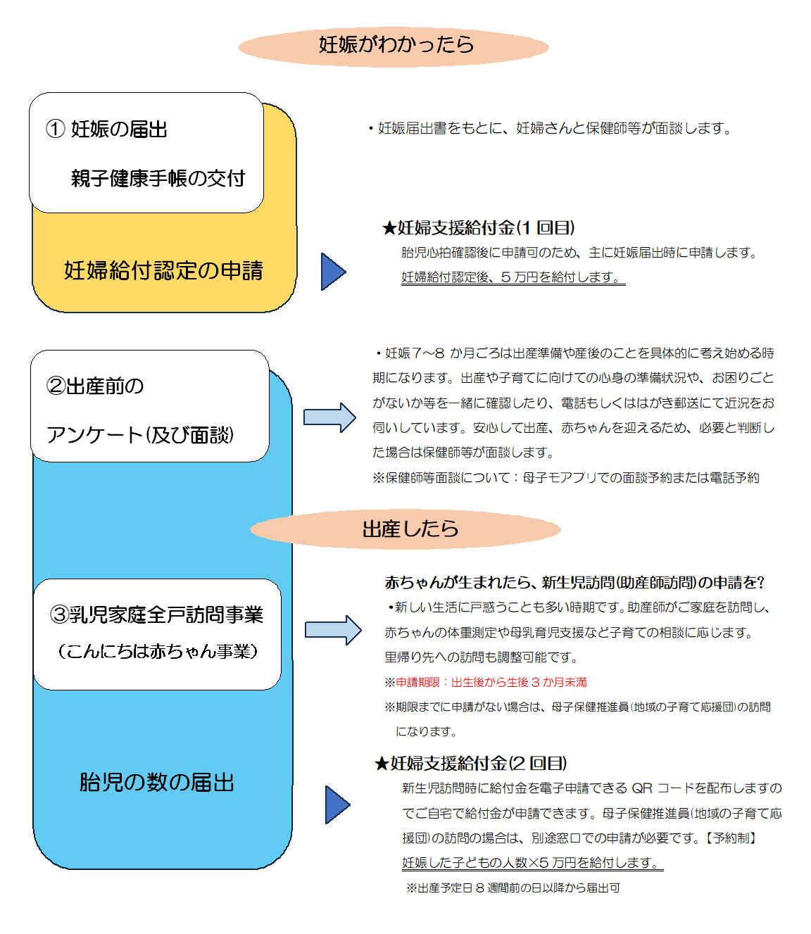 全ての妊婦及び子育て世帯を対象に、①妊娠届出(親子(母子)健康手帳交付)時、②妊娠8か月頃、③対象児童の出生後の家庭訪問(新生児訪問)等の際に、保健師または助産師等が出産・育児の見通しを立てるための面談を行います。各面談は、下記のとおり事前予約制になっています。