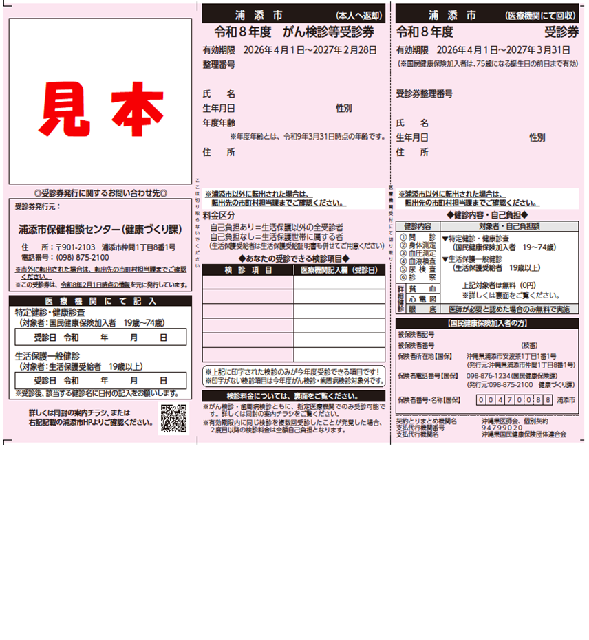 ※【令和8年度 健(検)診受診券】の再発行については、健康づくり課(TEL:098-875-2100)にお問合せください。