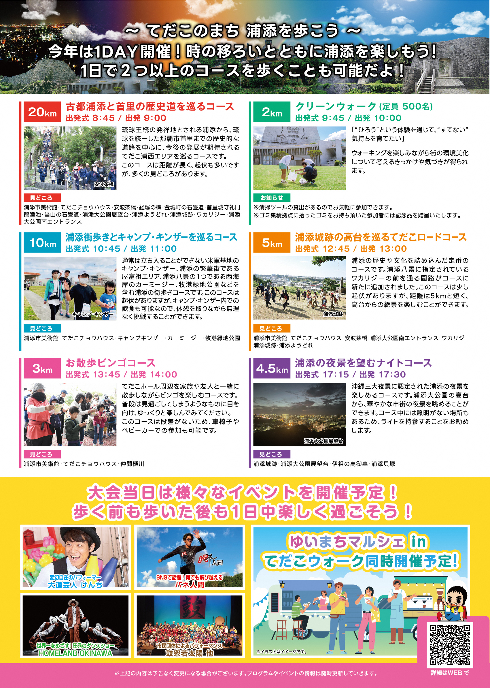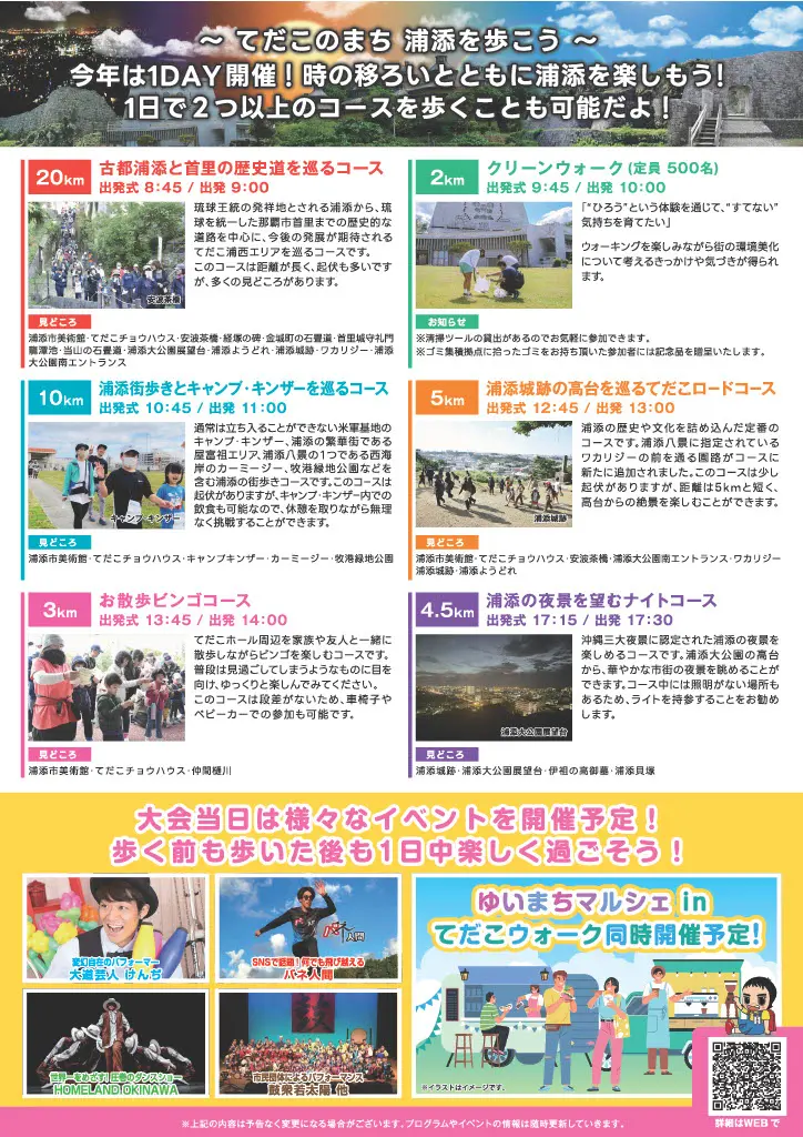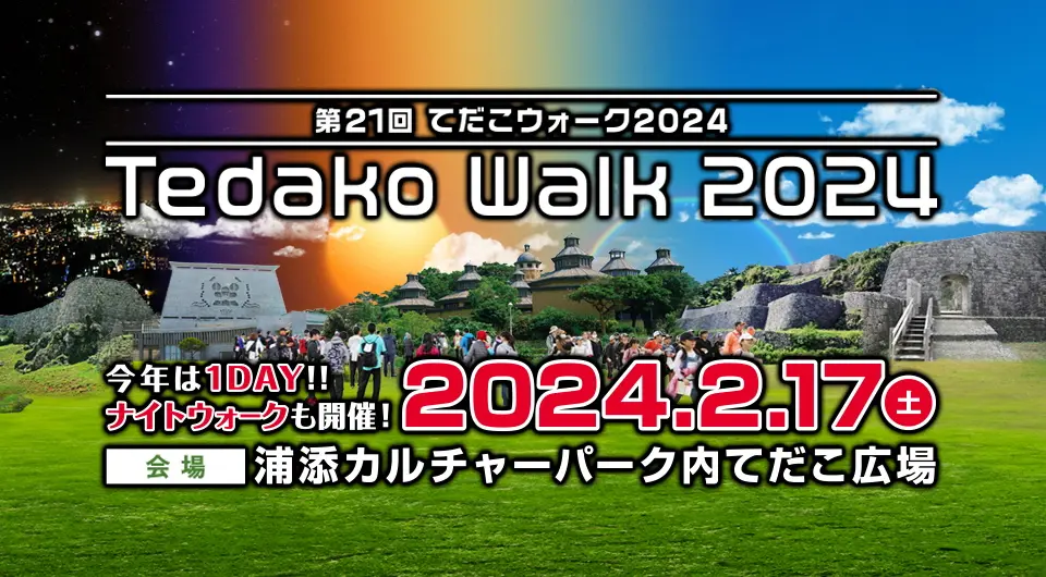 沖縄最大級のウォーキングイベントとして県内外より多くの方に参加していただき、21回目を迎える今大会は開催方法を刷新し、1日の開催となります。既存のコースに加え、家族で楽しめる「お散歩ビンゴコース」、ウォーキングを楽しみながら環境保全や社会貢献につながる「クリーンウォーク」、沖縄三大夜景に認定された浦添の夜景を楽しむ「浦添の夜景を望むナイトコース」が追加となりました。