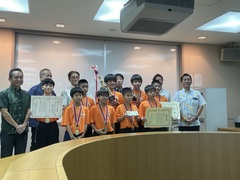 9月19日(木)、8月に行われた全国小学生ハンドボール大会の結果について神森ハンドボールの選手の皆さんが、市長へ優勝報告しました。松本哲次市長から「てだこ市民賞」を授与されました。その後市長や教育長からお祝いの言葉をいただきました。おめでとうございます。