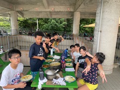 自然教室に参加している5年生、班ごとに別れ男女協力しながら野外炊飯にチャレンジしました。各々の役割を責任をもって活動しました。できあがったカレーライスはおいしくいただきました。