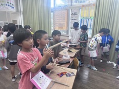 本日、1年生と2年生が一緒になり「おもちゃ祭り(生活科)」を行いました。「これ、こうやるんだよ」と2年生が1年生へ手作りのおもちゃで遊ばせてくれました。どの子も笑顔が絶えず「楽しい!」という声でいっぱいでした。