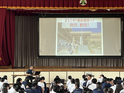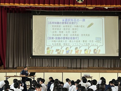 第一回目は【浦添高校、宜野湾高校、那覇国際高校】、第二回目は、【浦添工業、浦添商業、陽明高校】の先生方に学校紹介や、カリキュラム、取得できる資格や卒業後の進路等を説明していただきました。特に、二回目はとても暑い中でしたが、 これから進路決定する生徒も多いため3年生全員と参加希望の保護者に対しお話ししていただきました。ありがとうございました。
