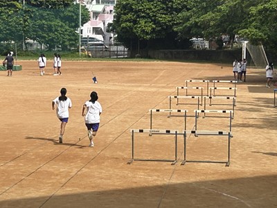 短距離、長距離、ハードル、高跳び、幅跳びのうち、2種目を選び履修。3年生になって別の3種目から2種目を履修し、2年間で4種目を選択履修するそうです。それぞれの種目でそれぞれの目標に合わせて主体的に練習し、周りの生徒からアドバイスをもらいながら協働的に学びを進めていました。