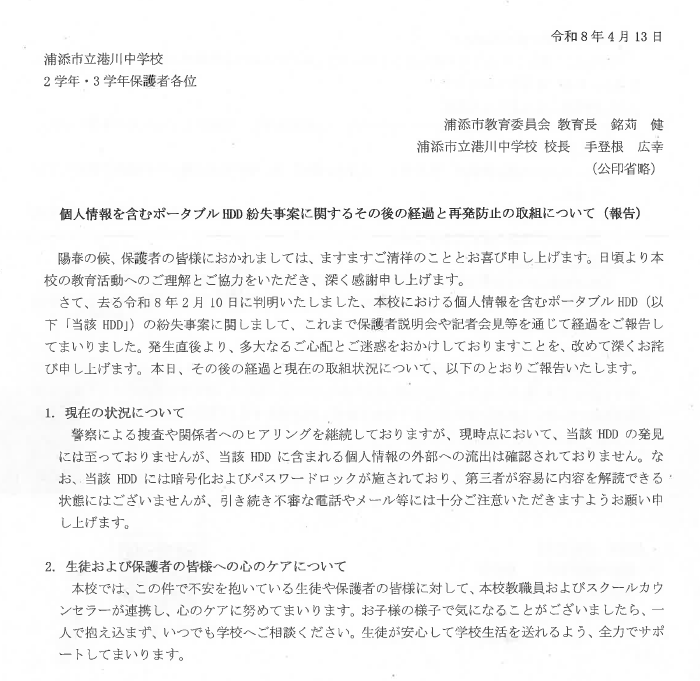 個人情報を含むポータブルHDD紛失事案に関するその後の経過と再発防止の取組について