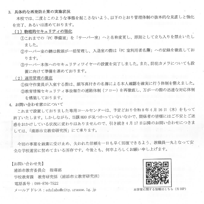 1年生保護者の皆様におかれましても、本件についてご不明な点がありましたら、学校あてにご連絡をお願いします。