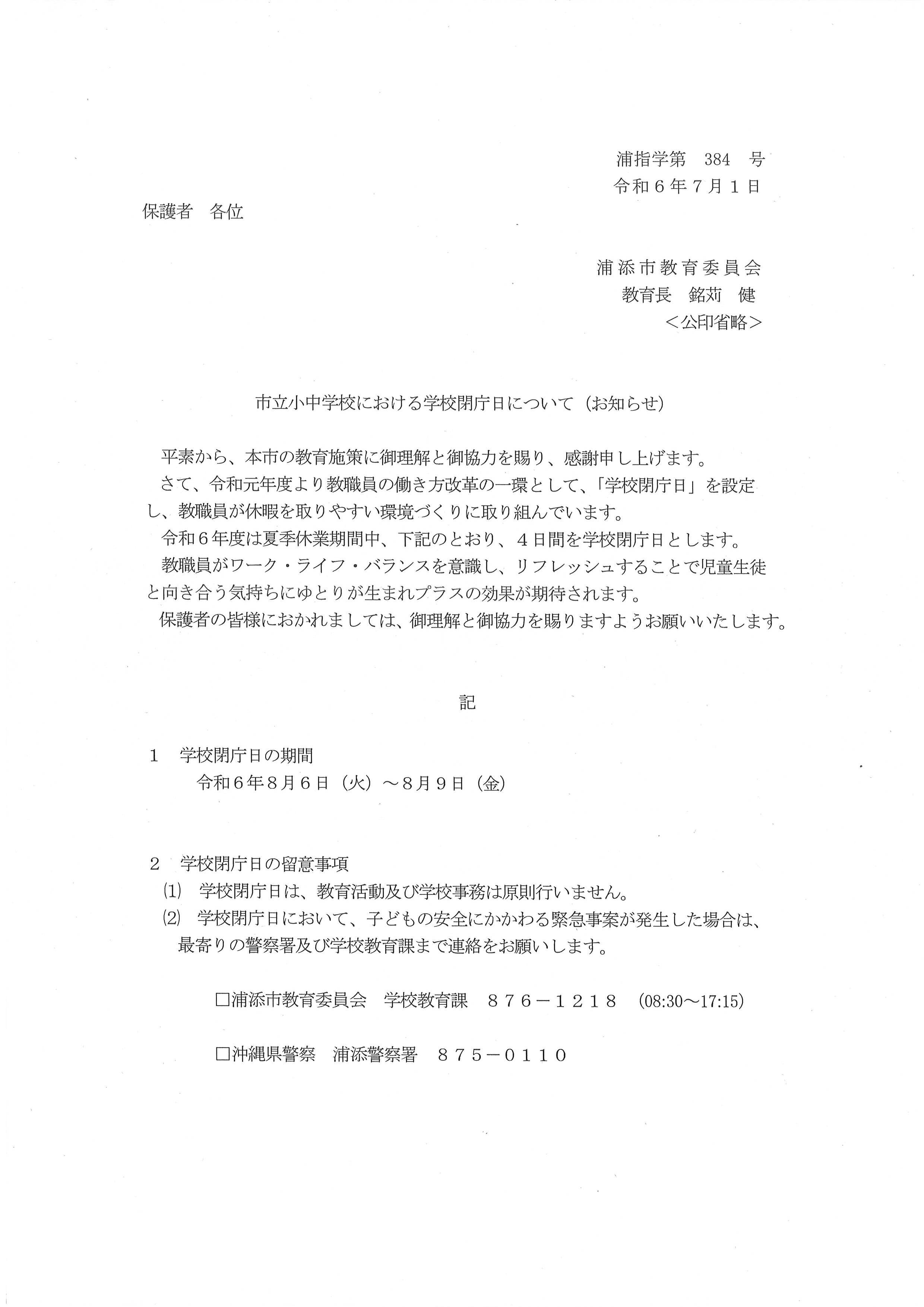 浦添市教育委員会より保護者宛文書がありましたのでお知らせします。