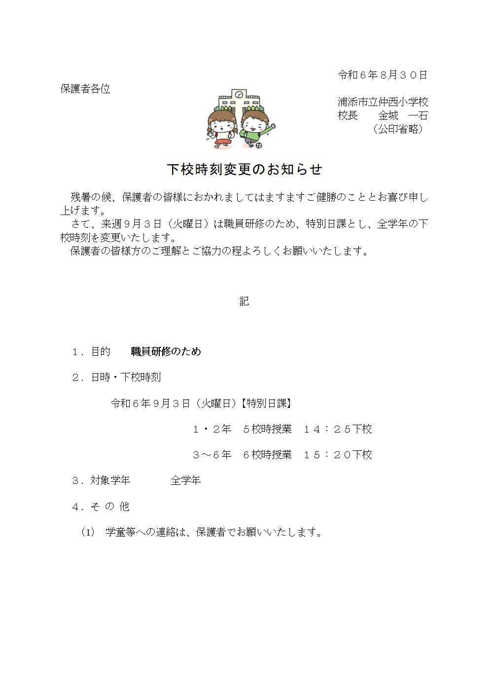 【6.8.30】下校時刻変更のお知らせ