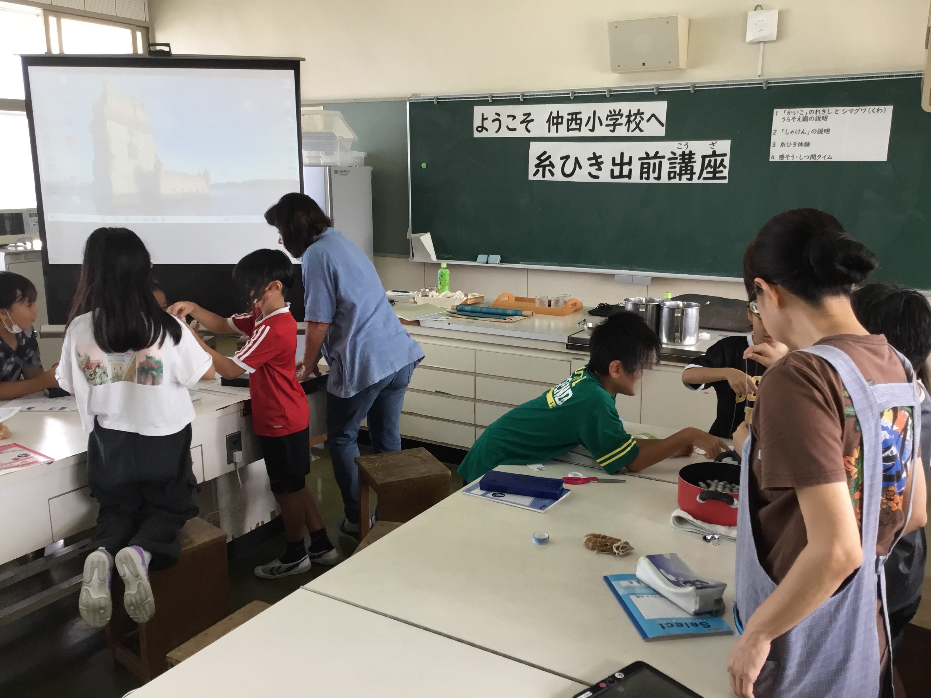 サン・シルクから3名の先生方をお招きして、糸ひき出前講座を実施しました。