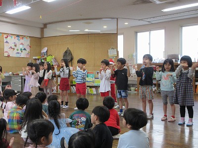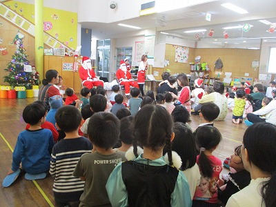 サンタさんから、クラスごとにプレゼントをもらったり、インタビューをしたり、先生の出し物や大型絵本をみて楽しで時間を過ごしてました。(*^▽^*)