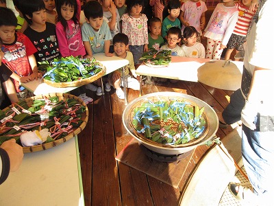 くま組さん、ほし組さんで、赤木会の皆さんに教えていただきながら、沖縄の伝統行事「ムーチー作り」に