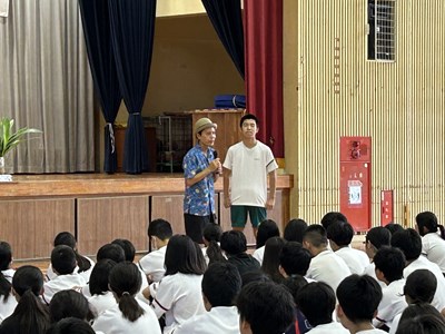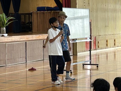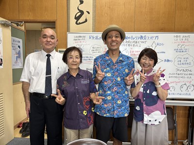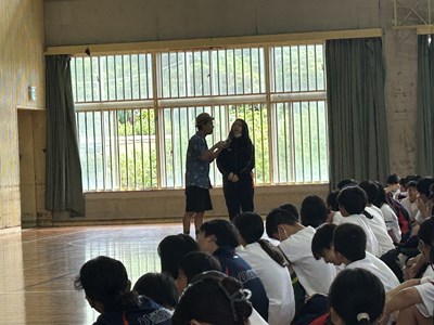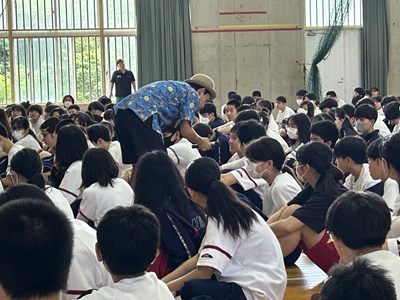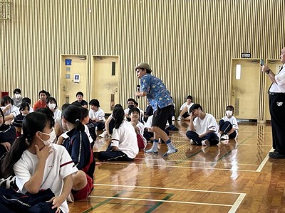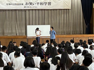 本日、慰霊の日に向けた平和学習で、お笑い芸人のまーちゃんさんを講師にお招きし、全校生徒に特設授業をしていただきました。「沖縄に基地は必要?」から始まり、「まるいもの」「平和」と、どんどん浦西中の生徒一人一人の意見をたくさん聞いてくださいました。最後は私たち一人一人のいろいろな「平和」についての価値観をとても身近なものにしてくれるあたたかな講演会になりました。みんなが笑顔になって、日常の生活の中のひとつひとつの幸せを大切にしていきたいなと思えるすてきな時間でした。まーちゃんさん、お忙しい中、浦西中学校の生徒のためにどうもありがとうございました!
