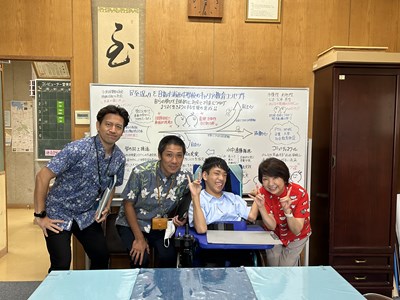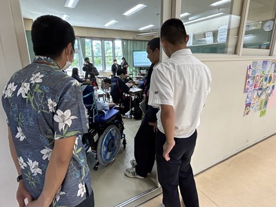 鏡ヶ丘特別支援学校の中学部の生徒さんが本校の3年4組で共に授業を受ける交流学習が行われました。3時間という限られた時間でしたが、本校の生徒にとっても貴重な経験になればと思いました。一回は会話してみてとそばにいた男子生徒に伝えたらすぐに話しかけている様子が見えました。「一緒に授業を受けることができてとても楽しかったです!」と校長室で本人の感想ももらいました。次はテストを実際に受験する交流と12月にはボッチャ競技交流が計画されています。相互理解につながるようこれからも多くの関りが持てたらいいですね。「鏡ヶ丘で流行っているキツネポーズ」を教えてもらい記念撮影しました!