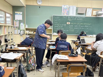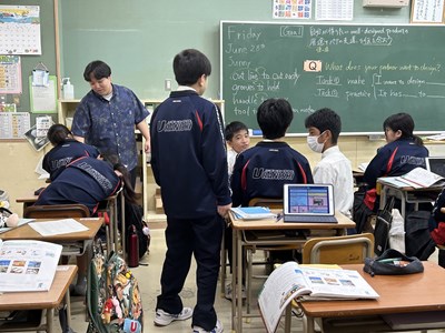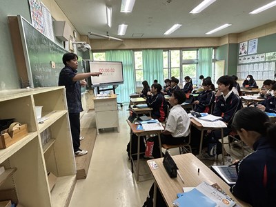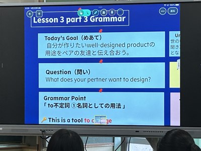當間颯太先生による英語の研究授業が2年3組で行われました。自分が作りたいウェルデザインの用途をペアで伝え合う授業でした。3組さんが何をデザインしたいのか聞いてみたら「物を無限に入れられるバッグ」や「すぐ乾くドライヤー」「異星間ロケット」「どこでもドア」など実用的な物から発明品のような物までありました。「~のための機能」というところを説明し合えるよう一生懸命英作文している様子がありました。
