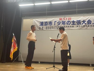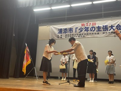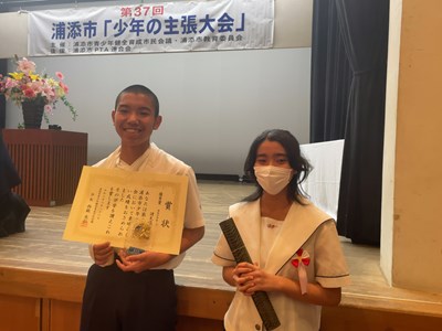 去る6月28日に、ハーモニーセンターにおいて第37回浦添市少年の主張大会が開催されました。本校から代表3年生2名が出場し、諸見さんは「本気の証」、堀川さんが「生きやすい社会をつくるためには」の演題で、自身の体験を通した素晴らしい発表をしてくれました。結果は諸見さんが優秀賞、堀川さんが優良賞を受賞しました。優秀賞の諸見さんは那覇地区大会に浦添市の代表として出場することが決定しました。2人ともよく頑張りました。国語科の先生方、ご指導ありがとうございました!