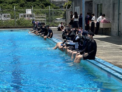 今年は水不足だったため例年と計画を変えて7月1日から浦西中学校でもプール開きが行われました。始めるにあたり教頭先生と体育主任の友利先生と一緒に安全祈願を行いました。4校時最初にプールの授業が行われたのは2年1組さんでした。歓声をあげて水をかけあいとても楽しそうです。これからますます暑くなるので水泳の時間は嬉しいですよね。安全に気を付けて充実した水泳授業にしましょうね!