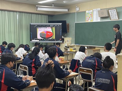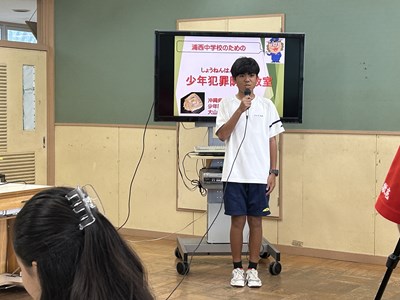夏休みを前に、本校では県警察本部少年課から大山哲警部補を講師にお招きし、「少年犯罪防止教室」を実施しました。本部会場の被服室から各教室をつないでの実施でしたが、メモを取りながらしっかりと講話を聴くことができていました。深夜徘徊や飲酒・喫煙・闇バイト・SNSでの誹謗中傷など、中学生を取り巻く様々な危険な行為から自分の身をいかに守るか、犯罪にかかわらないようにするためにも、想像力やイメージする力、見通す力をしっかりと身に付けて日々防止に努めていきましょう。