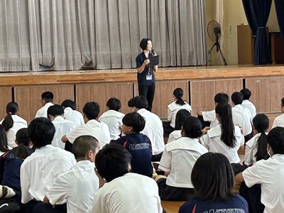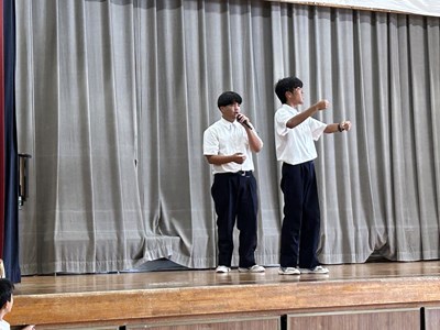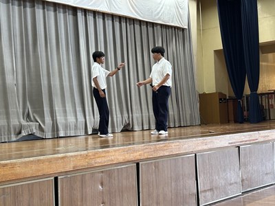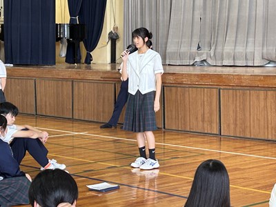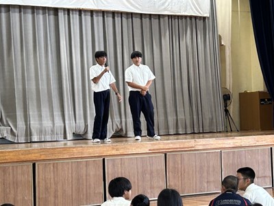 2学年の学年朝会は体育館で行われました。1学期の級長さんから振り返りの発表があり、各クラスの1学期の成果と課題が発表されました。絆が深まったことや、授業での発言が多くなったことなどが成果としてあげられ、課題は授業の準備が遅いこと、休み時間とのメリハリがつけられなかったことなどがあげられました。2学期ではそれらを改善できるように頑張りましょう。後半は生徒がエントリーする出し物の発表で、ショートコントとダンスが披露されました。修学旅行に向けて生活面もしっかり整えていきながら、浦西中らしく余興大会も今から学年で盛り上げていこうとしています。