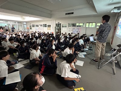 2学年の総合で、ハッピートラベルプロジェクトガイダンスが行われています。沖縄コンベンションビューローの田野さんを講師にお招きし、「沖縄観光の現在と未来」について、講話をしていただきました。事前に2年生の皆さんが沖縄の観光課題や成長性がありそうなところを考えてくれていますが、今日の講話内容から、自分たちの探究課題の設定にどんどん役立ててほしいです。