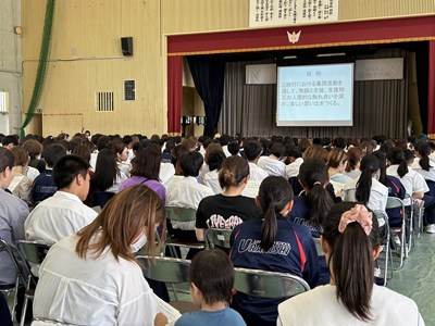 本日午後、2年生の生徒、保護者を対象に令和6年度の修学旅行説明会が行われました。体育館はとても暑かったのですが、最後までしっかりと説明を聞いて下さりありがとうございます。思い出いっぱいの修学旅行になるよう、ご家庭での健康管理や持ち物の準備等、ぜひご協力よろしくお願いします。