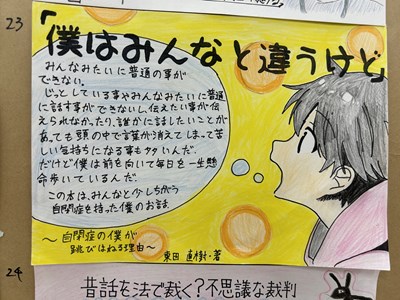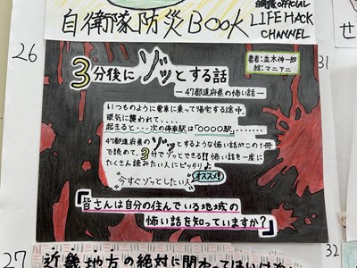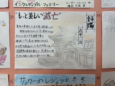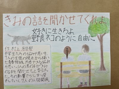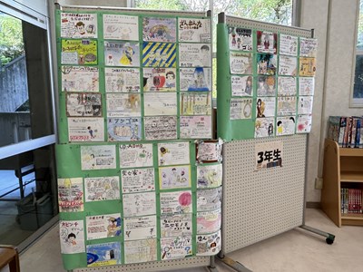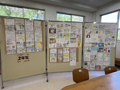 読書月間の取り組みとして、全校生徒から本のPOPを募集しています。学年ごとに展示されている図書館を見学しました。生徒一人一人が描いたイラストとPOPを見ながら魅力を伝える表現の違いを味わうとてもよい機会だと感じました。