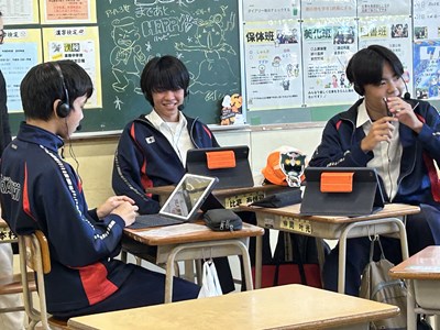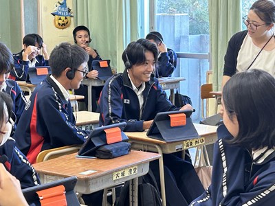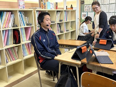 公開日 2024年10月21日 3年2組の英語の授業で、台湾の中学生とオンラインでつながって自己紹介をし合う実践が行われました。自分の興味あるもの、好きな食べ物など、自分の番になったら緊張しながらも楽しそうに自己紹介していました。