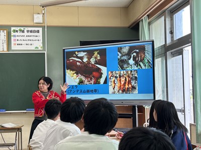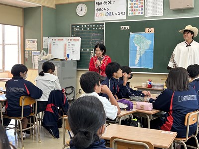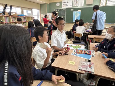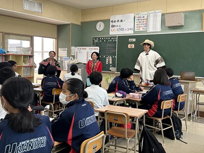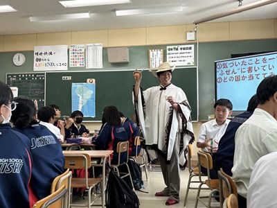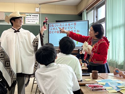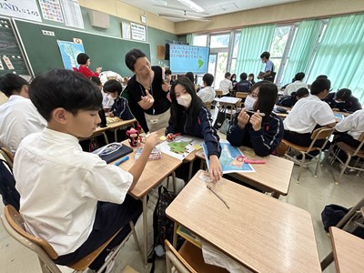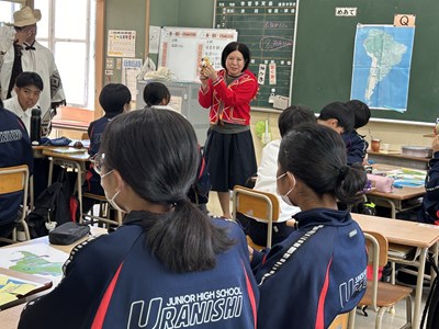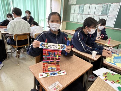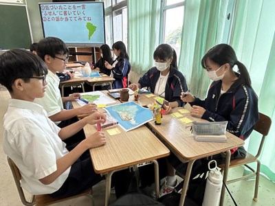 本日4校時、JICA沖縄から3名のゲストティーチャーをお招きし、1年1組で社会科の授業が行われました。実際に海外青年協力隊で南米に行かれた皆さんが、様々なモノを準備してくださったので、生徒の皆さんが実際にモノを見て触って、匂いをかいでみて、五感を働かせて気づいたことを付箋紙に書きながら楽しく授業が展開しました。1組さんは初めて見るモノがいったい「これ何に使うもの?」と興味しんしんです。今日の気づきがこれからの社会科の授業で生かされるといいですね。JICA沖縄の皆さん、楽しい授業をありがとうございました!