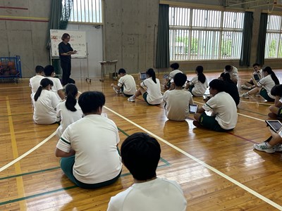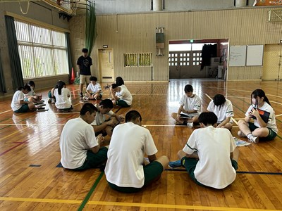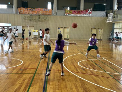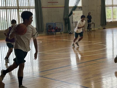 体育の授業でバスケットボールに取り組んでいる3年5組の授業を参観しました。体育館を広々と使用して、のびのびと楽しそうに活動しています。3対3のゲームを通してチームの課題を見つけて解決策を考える授業でした。男子と女子が協力してゲームを楽しんでいる様子を見ることができました。