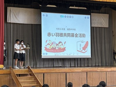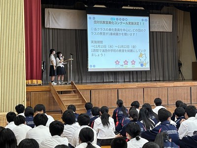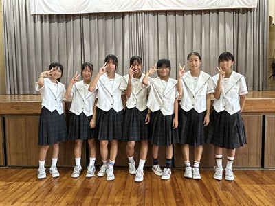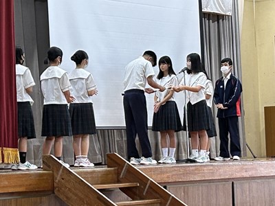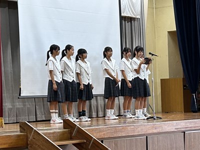 本日の生徒会朝会では、各種専門委員会の活動による表彰と県駅伝競走大会に那覇地区代表として出場する女子駅伝チームの選手激励会が行われました。生活委員会の遅刻ゼロ運動と図書委員会によるポップコンテストでの団や個人の表彰に続き、福祉委員会による赤い羽根共同募金の案内がありました。その後、今週土曜日に石垣市で開催される県駅伝競走大会に出場する皆さんの決意表明が行われました。気合の入ったとてもいい表情の女子駅伝チームでした。きっと男子の分まで頑張ってくれることでしょう。みんなで応援しています!