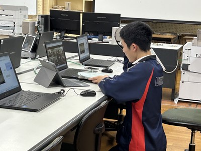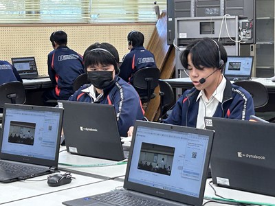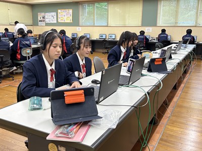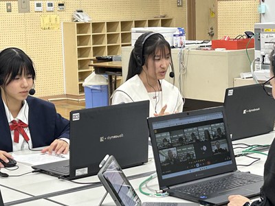 先週、文科省調査官招聘の英語の授業を行った3年2組の皆さんが、コンピュータ教室にてオンラインで台湾の中学生と意見交換を行いました。ヘッドセットを付けてグループチャットで、これまでの授業で取り組んできた「働きがい」や「理想の働き方」ついて将来の自分をイメージしながらお互いに英語で意見を交換しました。自分の話している様子はタブレットで動画を撮りパフォーマンステストとしています。少し緊張しながらも、伝える相手が海外にいることで、楽しそうにコミュニケーションを図ろうとする様子がうかがえました。