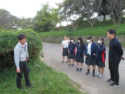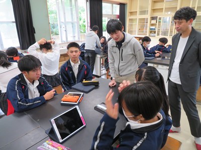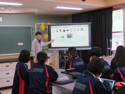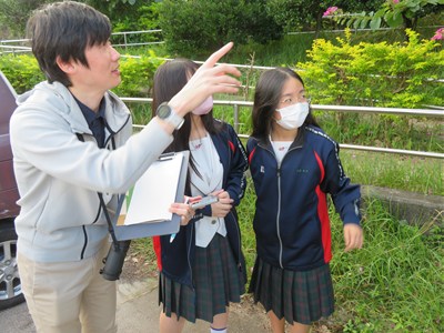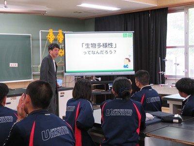本日3年5組の理科の授業で、「生物多様性」や生態系について体験的に学ぶ出前授業が行われました。講師をしてくださったのはユニクロ サステナビリティ部の佐久間さん・岡田さん、株式会社シンク・ネイチャーの渡邉さん、五十里さんです。まずユニクロさんからは、私たちの生活が生きものとどのように密接につながっているか、SDG'sの視点からユニクロの企業としての様々な取り組みを説明していただきました。シンク・ネイチャーさんは、開発したアプリを使って、浦西中学校周辺で出会える生きものについて紹介してくれました。2時間目は実際にフィールドワークに出て様々な植物や昆虫など、アプリで確認しながら説明を受けていました。5組さんはこの貴重な出前授業を通して、身の回りの生きものと自分とのつながりを考えるきっかけになったと思います。自然豊かな浦西中学校だからこそ、フィールドワークと合わせて学びを深めることができました。講師の皆様、つないでくださった亮先生ありがとうございます。