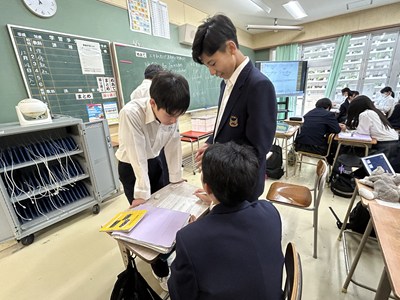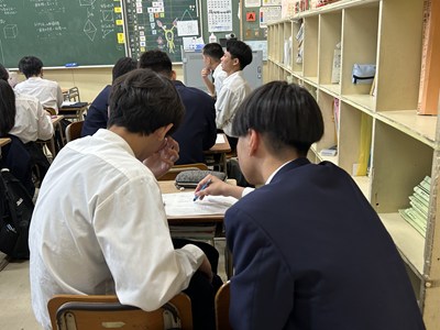 三者面談最終日。いよいよ明日は二学期終業式です。1学年では総合の時間に学年全体でキャリハピ祭に向けての取り組みを行っていました。3年生は国語の単元テストに真剣に取り組む姿、数学の難しい問題を友達同士教え合っている様子がありました。最近の3年生は勉強に対する一人一人の意識が高くなっています。さすが受験生です。