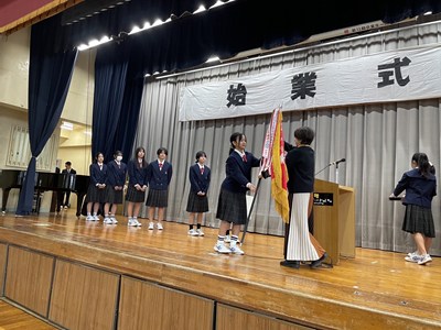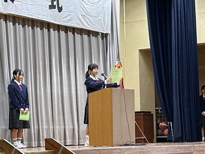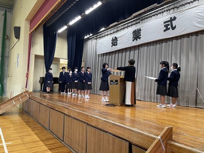 始業式後に全体表彰を行いました。那覇地区新人バドミントン競技大会での女子団体優勝や、社会科新聞コンクールの金賞受賞、受信環境クリーン図案コンクールの各社長賞、技術家庭科生徒作品展優秀賞、県アンサンブルコンテスト銀賞など多くの皆さんを表彰しました。今年もこの舞台で、生徒の皆さんの頑張りをたくさん称えることができるよう「文武両道の花咲く浦西中」で頑張っていきましょう。