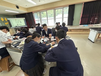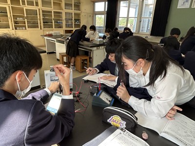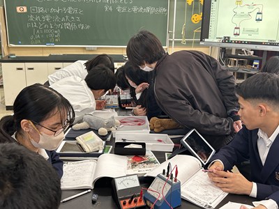 理科室で実験している1組の様子です。電圧計と電流計を一生懸命のぞき込んでいる1組さん。真紀子先生に「このグループはとってもいいデータがとれてるね」と褒められてすごく嬉しそうでした。みんなが交代して回路を触って目盛りを読み取っています。