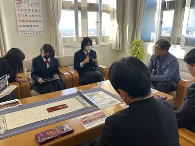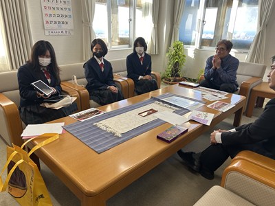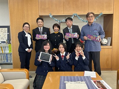 「紅芋ム~チもなか」発売を受けて、浦添市教育委員会銘苅健教育長を表敬訪問しました。商品企画ができあがるまでの道のりを詳しく楽しくプレゼンし、銘苅教育長、内田部長、照屋係長からのたくさんの質問にお答えしました。商品の魅力を存分にお伝えすることができた久高さん、儀部さん、仲宗根さん3名は口々に「とても楽しい時間だった」と嬉しそうです。最後は「ム~チベーション」を上げて夢に向かって頑張っていこう!と合言葉も出てきました。お忙しい中浦西中生徒を激励していただき心から感謝いたします。