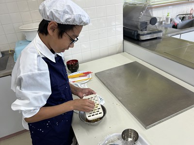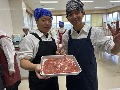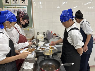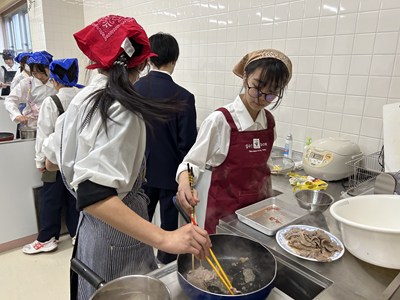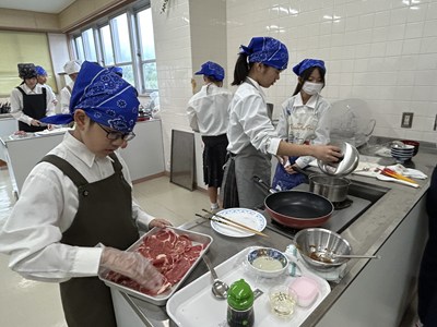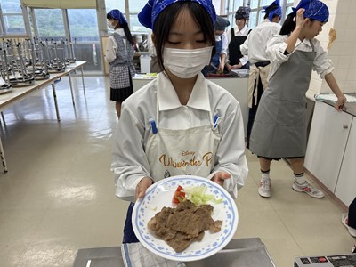 1年生の調理実習が始まっています。1・2校時に5組さんが実習しているところを見学しました。メニューは豚肉のしょうが焼きと大根と油揚げの味噌汁、ごはんです。グループで分担して声をかけあって楽しそうに作業していました。たれをからめながら上手に肉を焼いていい匂いがしていましたよ。ぜひ家でもしょうが焼きを作って家族にごちそうする機会があったらいいですね。