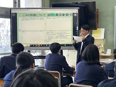 保健の授業で3年2組さんは、私たち浦添市でごみの管理をどのようにしているのか、またごみの処理で一人一人が生活の中で心がけることは何かを考えていました。浦添市クリーンセンターやリサイクルプラザについてネットで調べたり、3Rや循環型社会という言葉についても学んでいます。人が生活するうえで1日に約1Kgのごみを出しているそうです。環境にやさしく、しかも衛生的にごみを管理することも私たちに必要な力ですね。