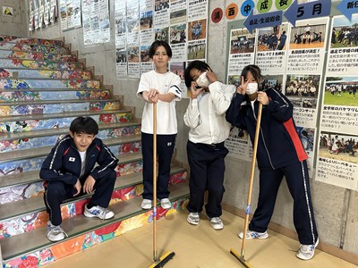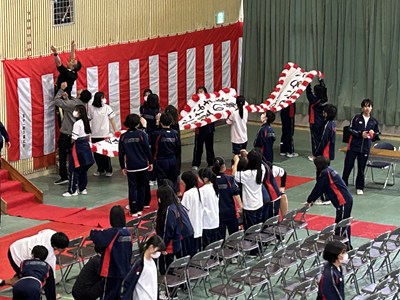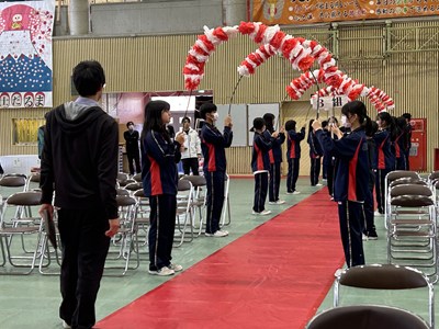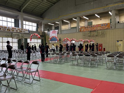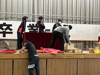 卒業式に向けての会場設営と入退場のリハーサルを行っています。3年生の思い出に残る卒業式にしようと、それぞれの役割を担って頑張っています!