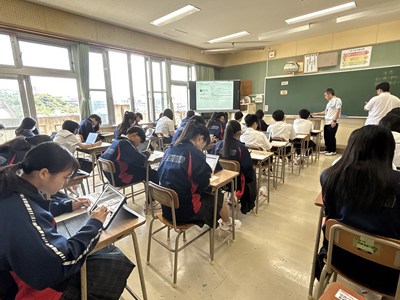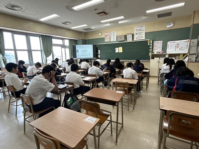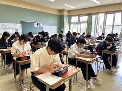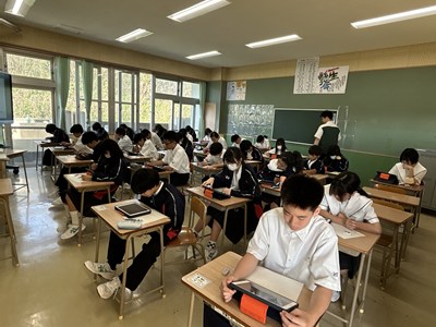 先週の3年生による全国学力調査に続き、本日1、2年生が「学びのたしかめ」CBT調査に挑戦しています。テスト席で個人のタブレットで解答を入力する方式ですすめます。2年生も1年生も数学の問題に真剣に取り組んでいます。