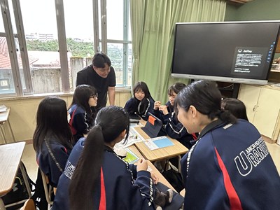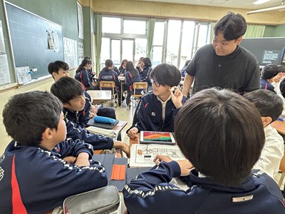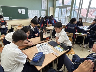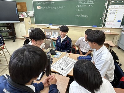 2年2組の英語の授業で楽しそうにサイコロトーキングで質問に答える授業を行っていました。遠足のグループにわかれてサイコロの目が出ただけ進みそのコマにある質問に一文をプラスして答えます。「会いたい人は誰?」や「好きな歌は何?」など、理由も一緒にプラスワンで答えながら英語でのコミュニケーションが楽しくなりますね。