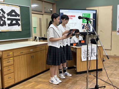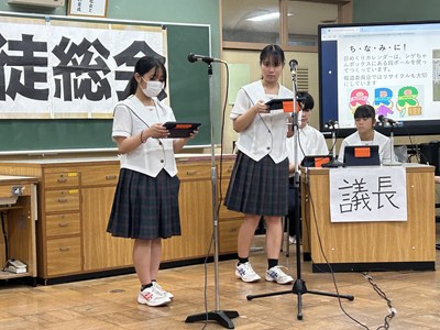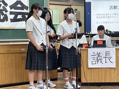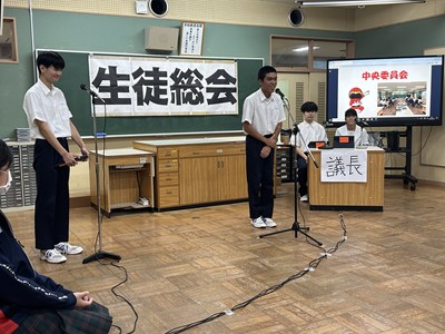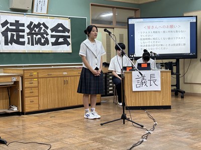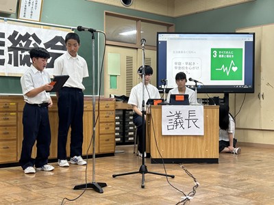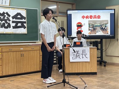 令和7年度の生徒総会が行われました。本会場と各学級をオンラインでつなぎ、全校生徒が参加しました。「文武両道の花咲く浦西中」をスローガンに掲げ、本校の生徒会活動はとても活発に行われています。今年度は活動目標に「学校や地域に参加することを喜びにできる最幸の浦西人~Let'sウェルビーイング~」と設定し、中央委員会、専門委員会の活動計画にもウェルビーイングの視点、SDGsの視点がちりばめられていました。浦西中生一人一人が生徒会員という自覚を持ち、これからますます活動を通して学校や地域へ貢献することを願っています!
