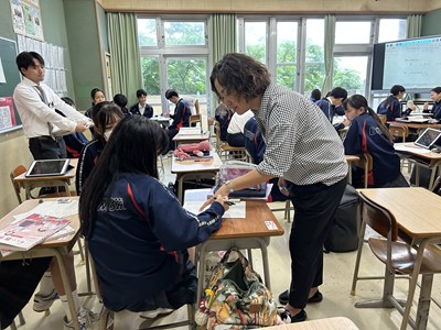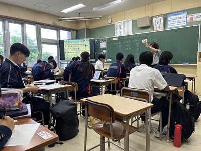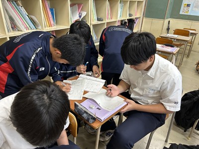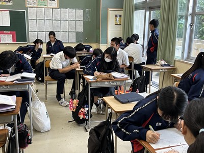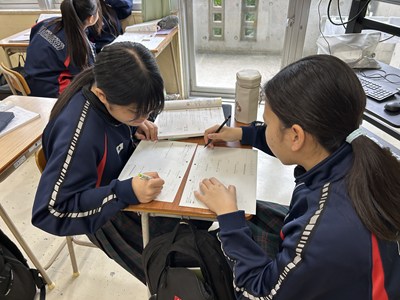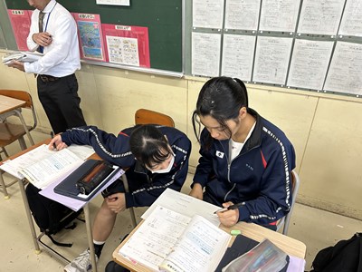 3年4組で眞榮城亜矢子先生による数学の研究授業が行われました。根号のついた数を変形する問題に挑戦する授業でした。事前課題で解答した例が紹介されたあと、今日の課題のプリントにそれぞれ取り組みました。ルートの中が一番小さな自然数になるまで、全員が教え合い、学び合う姿が印象的でした。最後の5分は確認テストが行われ、全員がロイロで提出しています。わからないままにしない地道に学ぶ姿はさすが3年生です。