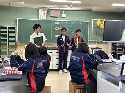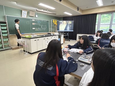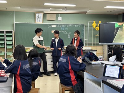 理科の授業で1年生は金属を重さで区別できるか実験していました。アルミニウムと鉄と銅の重さを量り、その後手のひらにのせて目をつむって感覚でわかるかどうかも実験していました。同じ体積にそろえることで金属を質量で区別することがわかりました。