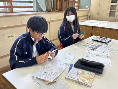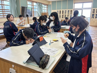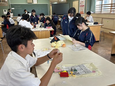 2年3組の家庭科の授業では幼児のおもちゃづくりを行っていました。キットのデザイン以外に自分でオリジナルのデザインをしてもいいようです。幼児が興味を持つようなデザインで頑張って制作してくださいね!
