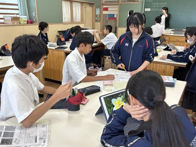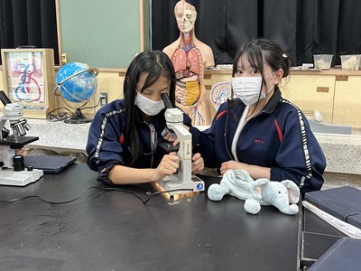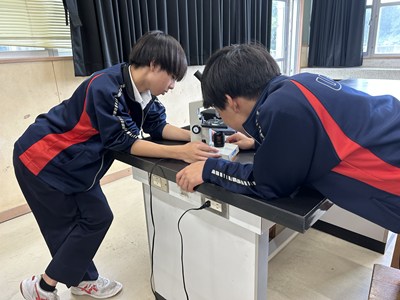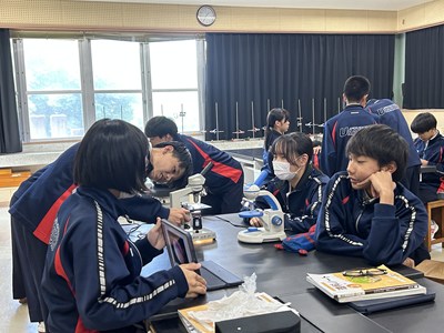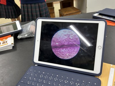 2年5組の理科では、植物の細胞を顕微鏡で観察していました。倍率を変えて細胞の中まではっきり見えるよう調節しています。きれいに見えたらハイタッチしていました。